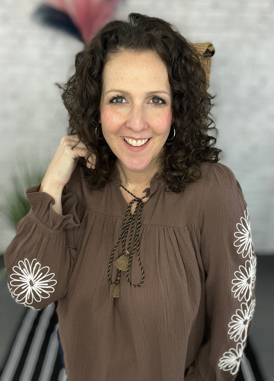 Cotton Top with Embroidered Flower Sleeves