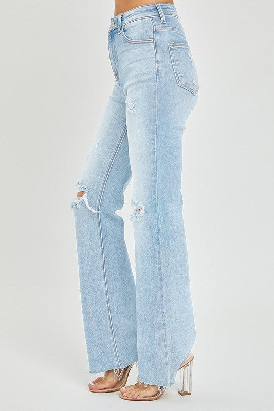 RISEN Light Wash Distressed Flare Jeans with Raw Hem