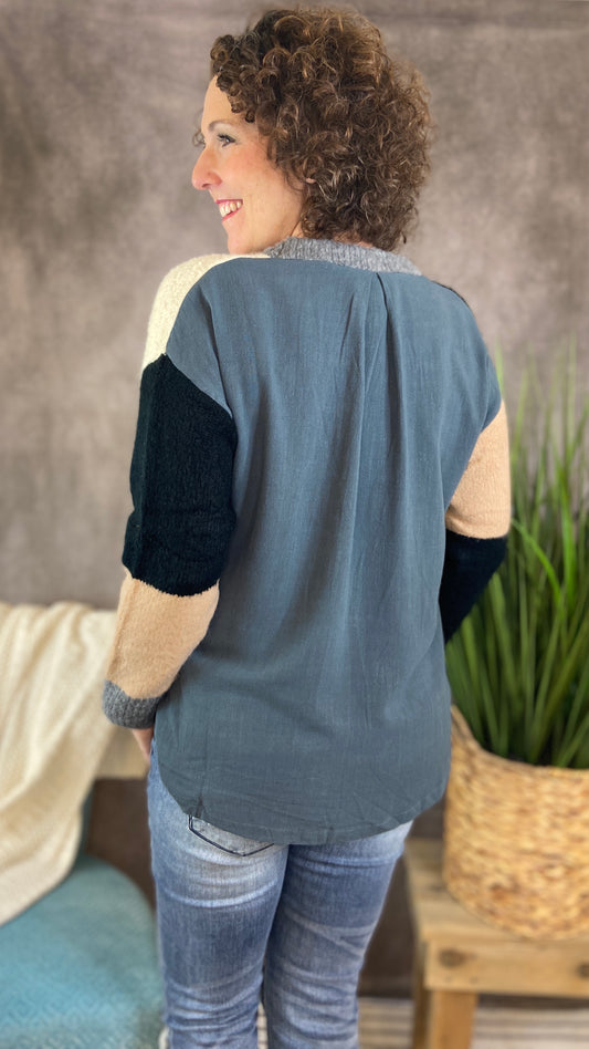 Colorblock Sweater with Long Fabric Back