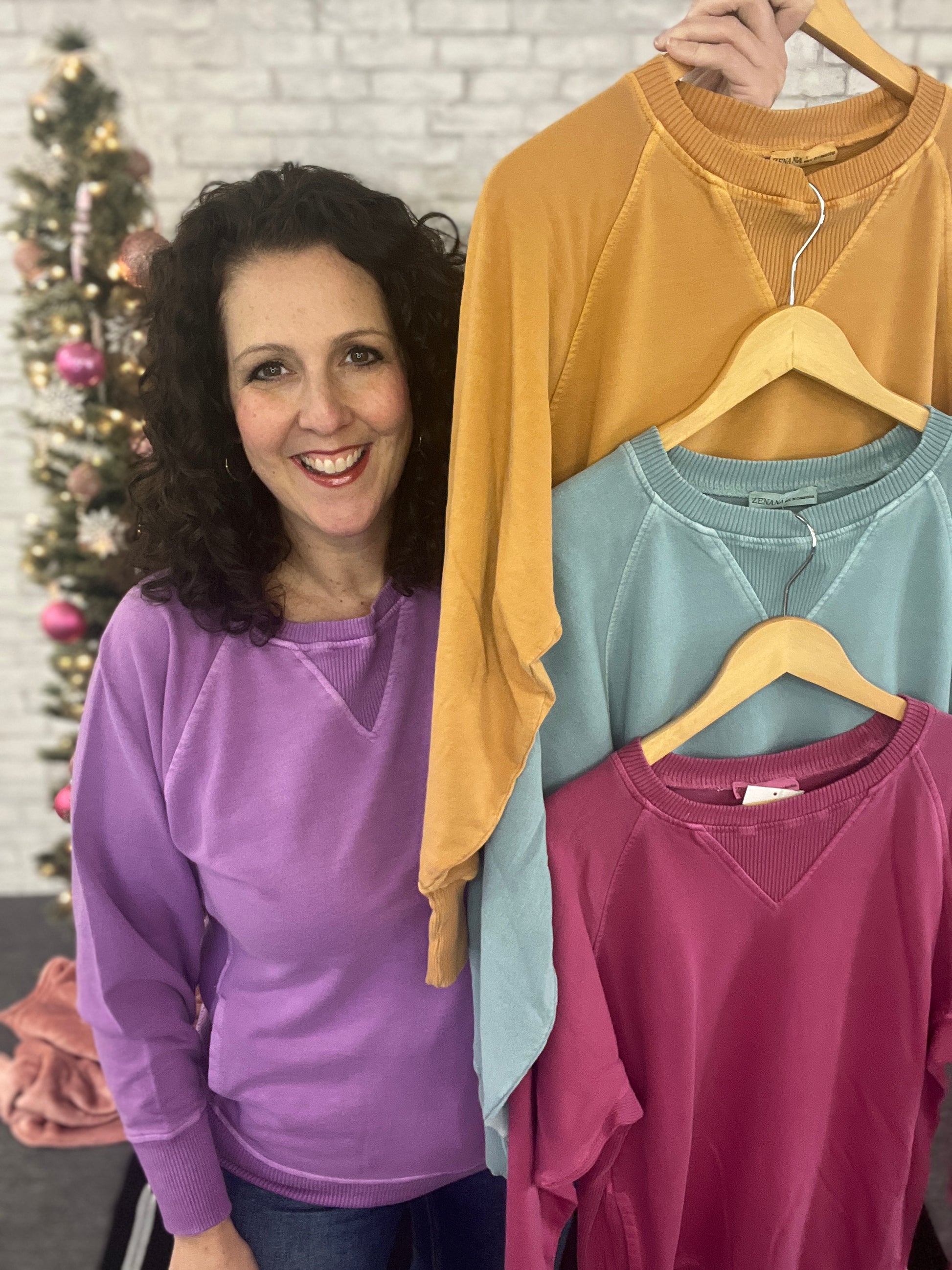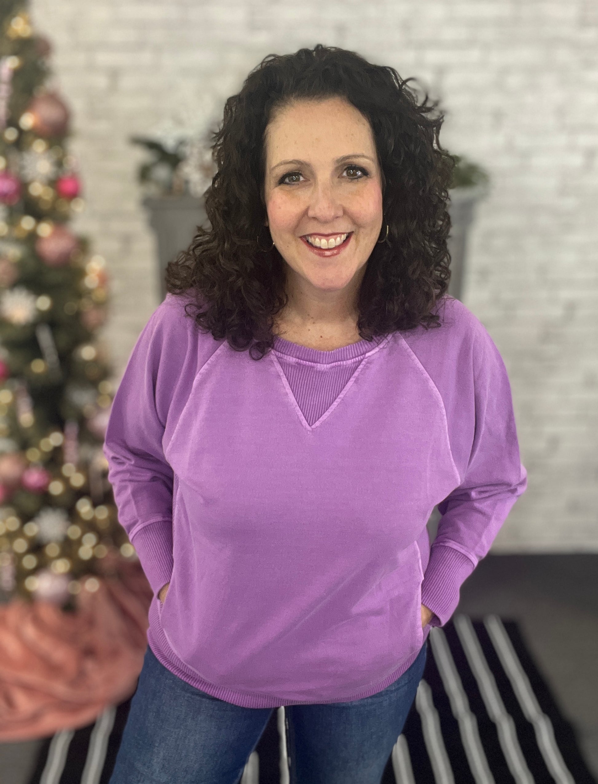 Our new favorite sweatshirt is here! The acid washed fabric adds style to this comfortable piece. Ribbed detailing at the neck and side panels make this sweatshirt unique. And, it’s got pockets!! We don’t know how you’ll decide which color you will need - we love them all!