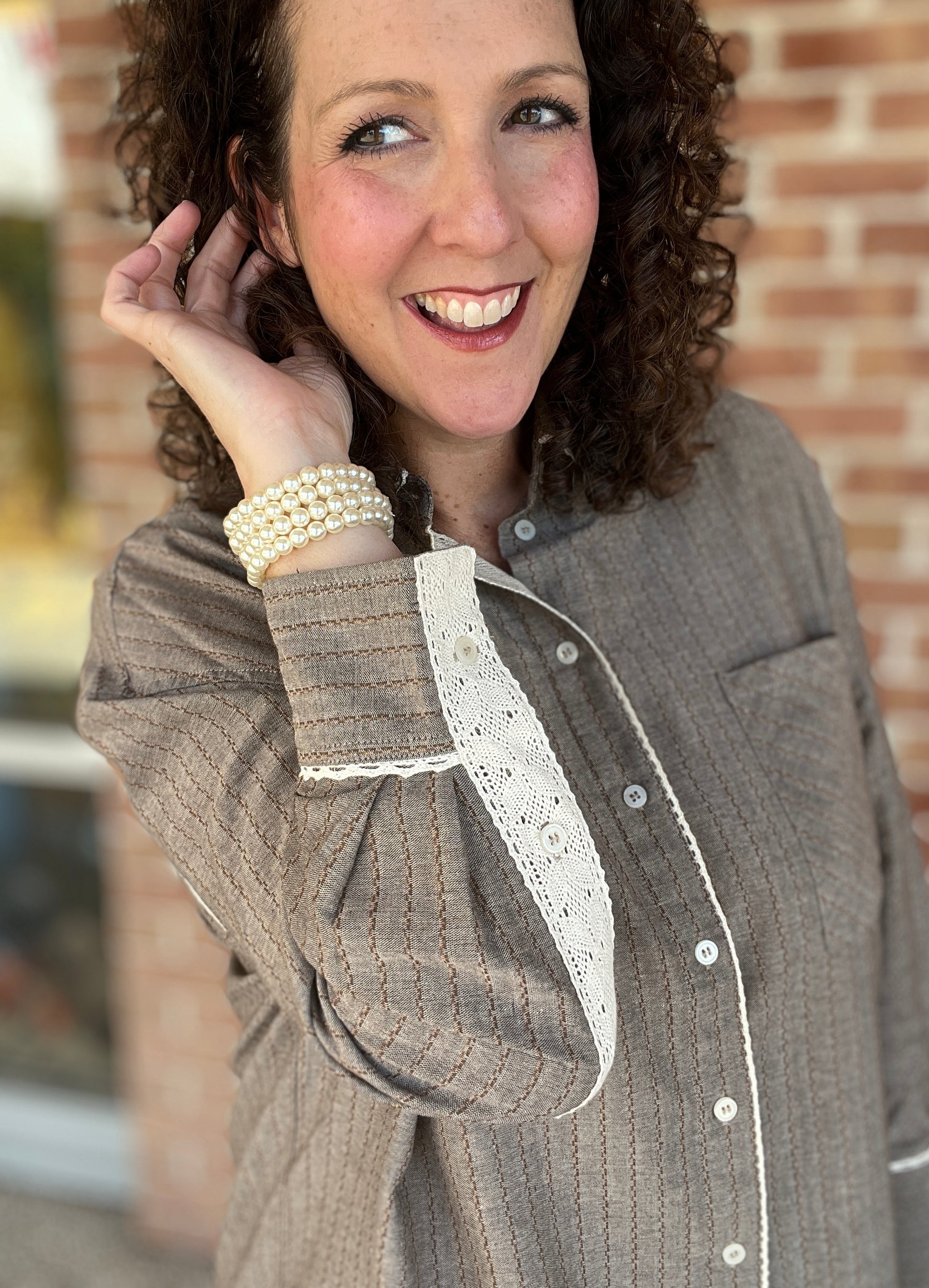 This charming button-down combines a textured brown fabric with soft cream lace trim for a whimsical twist on a classic silhouette. Its structured design keeps things sharp, while the delicate lace adds a playful touch, making it perfect for those who love a little fun with their fashion essentials.