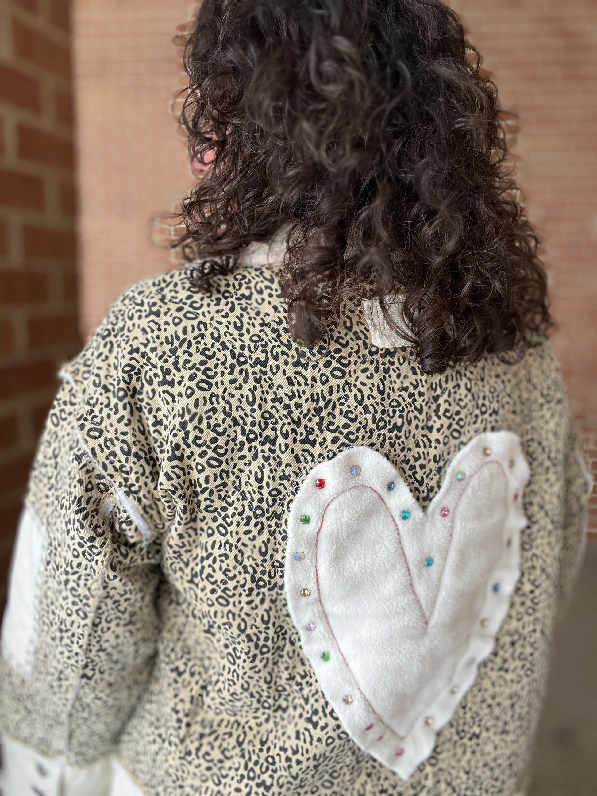 Make a statement with this leopard-print blazer-style jacket that's equal parts sass and sophistication. Crafted from a luxe mixed fabric blend, it features a sharp collar perfect for dressing up any outfit. The real showstopper? A heart design stitched across the back and adorned with sparkling rhinestones—because love should always be visible. Whether you're heading to brunch or a night out, this jacket proves that style and personality go hand in hand.