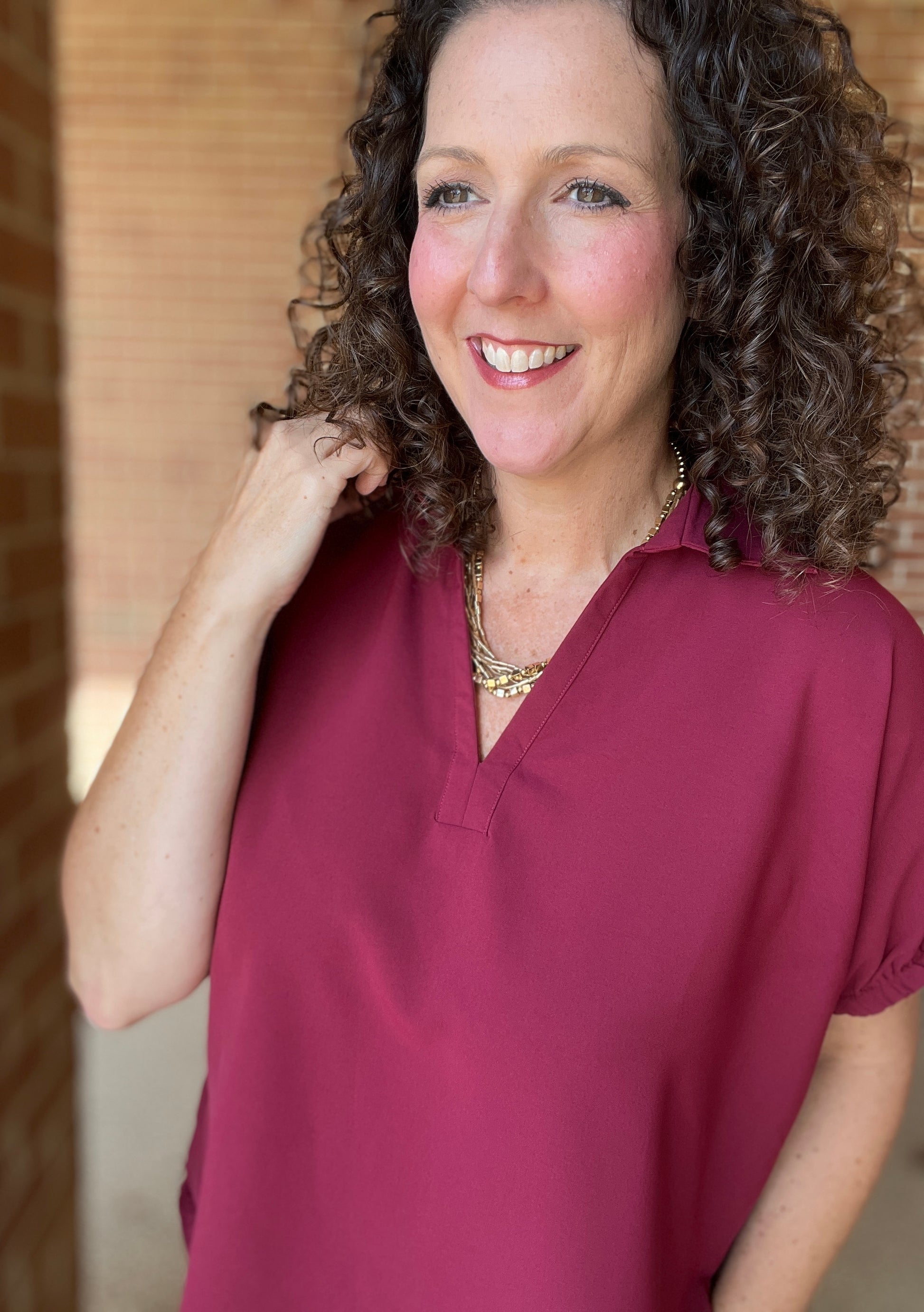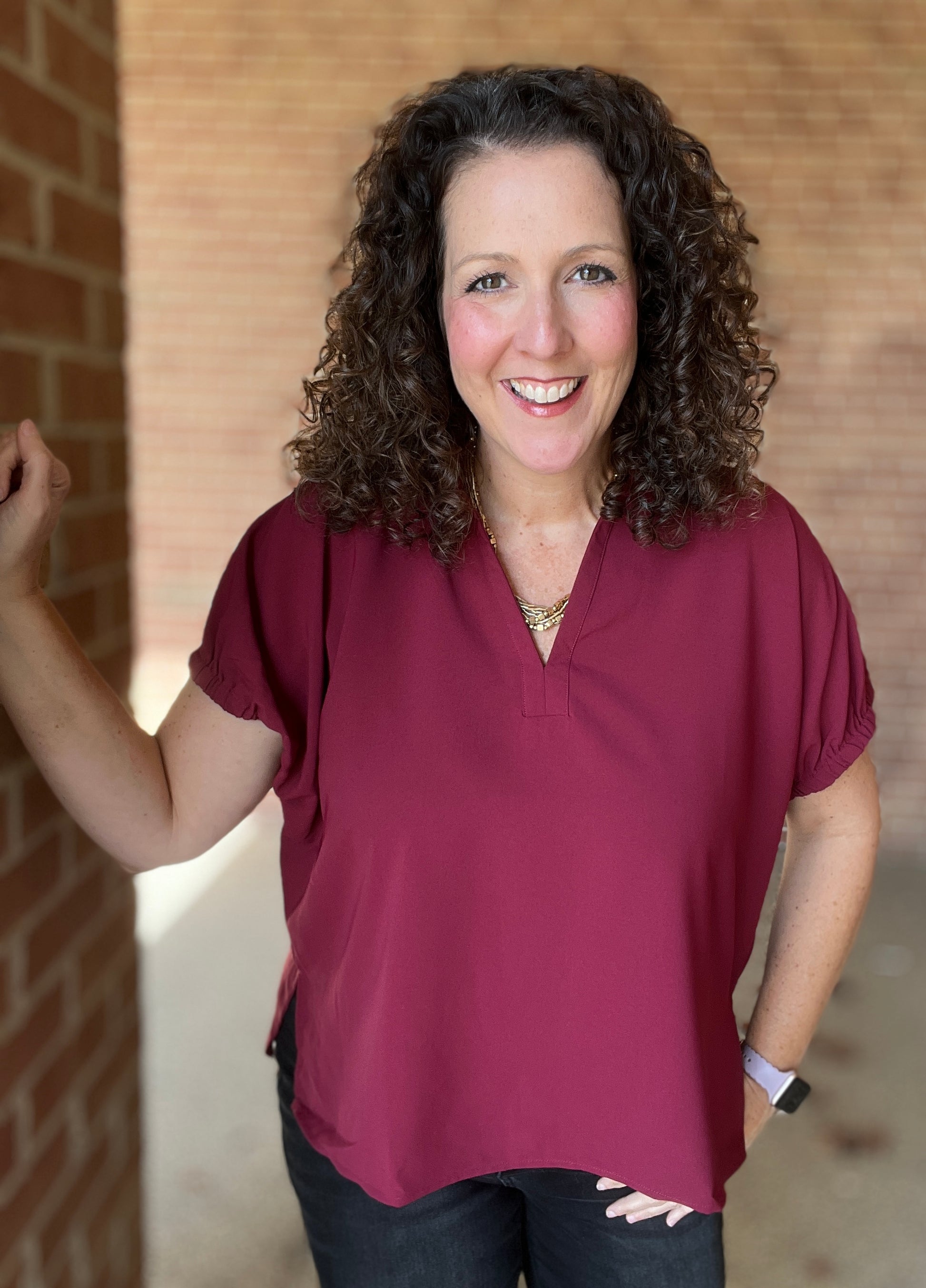 Experience cozy comfort with this Split Neck Top, crafted from smooth, cool-to-the-touch fabric that feels great all day long. Its perfect shade of wine adds a pop of playful color, while the elastic-edged sleeves provide a snug yet flexible fit. Designed with a relaxed silhouette and side slits, this top lets you move freely and stay effortlessly stylish.