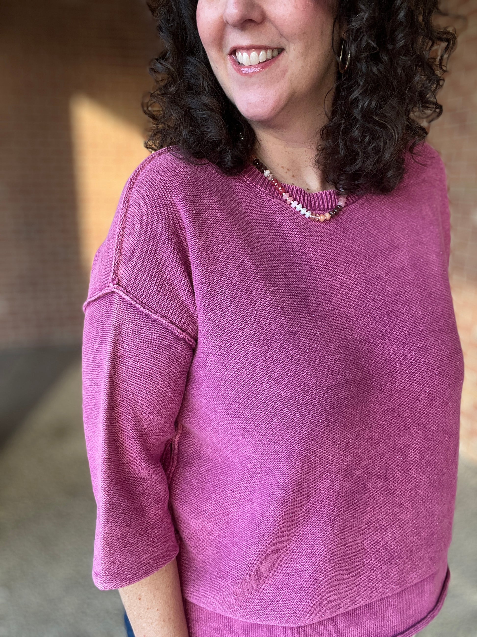 Throw on this boxy sweater and get ready for compliments! The lightweight knit keeps things comfy without the bulk, while the acid wash finish gives it that effortlessly cool, lived-in vibe. Three-quarter sleeves are perfect for layering or showing off your favorite bracelets, and the exposed seams add an edgy touch that sets it apart. Available in gorgeous colors that'll have you reaching for it again and again.